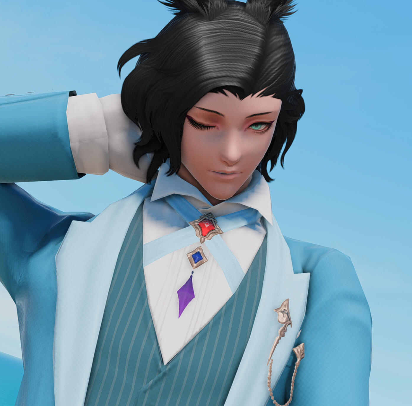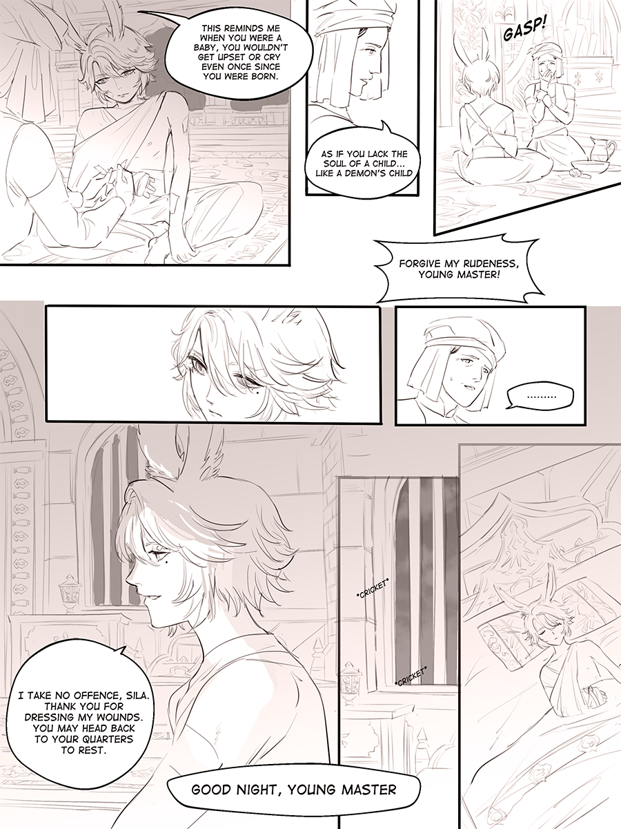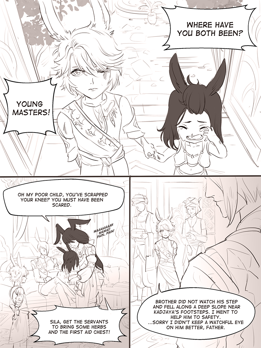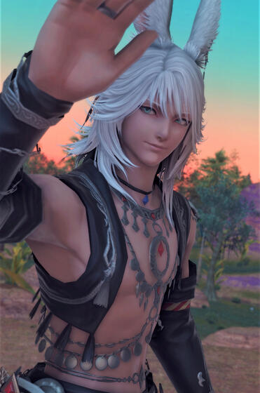 Nirav retains most of Azem looks, though as a Viera beast. His Veena ancestors have planted their roots in Thavnair since the Seventh calamity and they are part of the noble caste. He wears his culture proudly, donning quality silks and partake in the local customs of having chai tea several times a day in between and with meals. He lives alone with his twin brother, with all their inheritance as a young lord.
